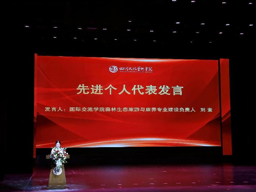 国际交流学院森林生态旅游与康养专业建设负责人刘素作为先进个人代表发言。她回顾了自己21年的从教历程,向学校的悉心培养和同仁的携手共进致以诚挚感谢,并重点介绍了学院近年来教学质量的显著提升。她指出,这一跨越式进步离不开全院师生在教学设计优化与实践教学创新等方面的不懈努力。