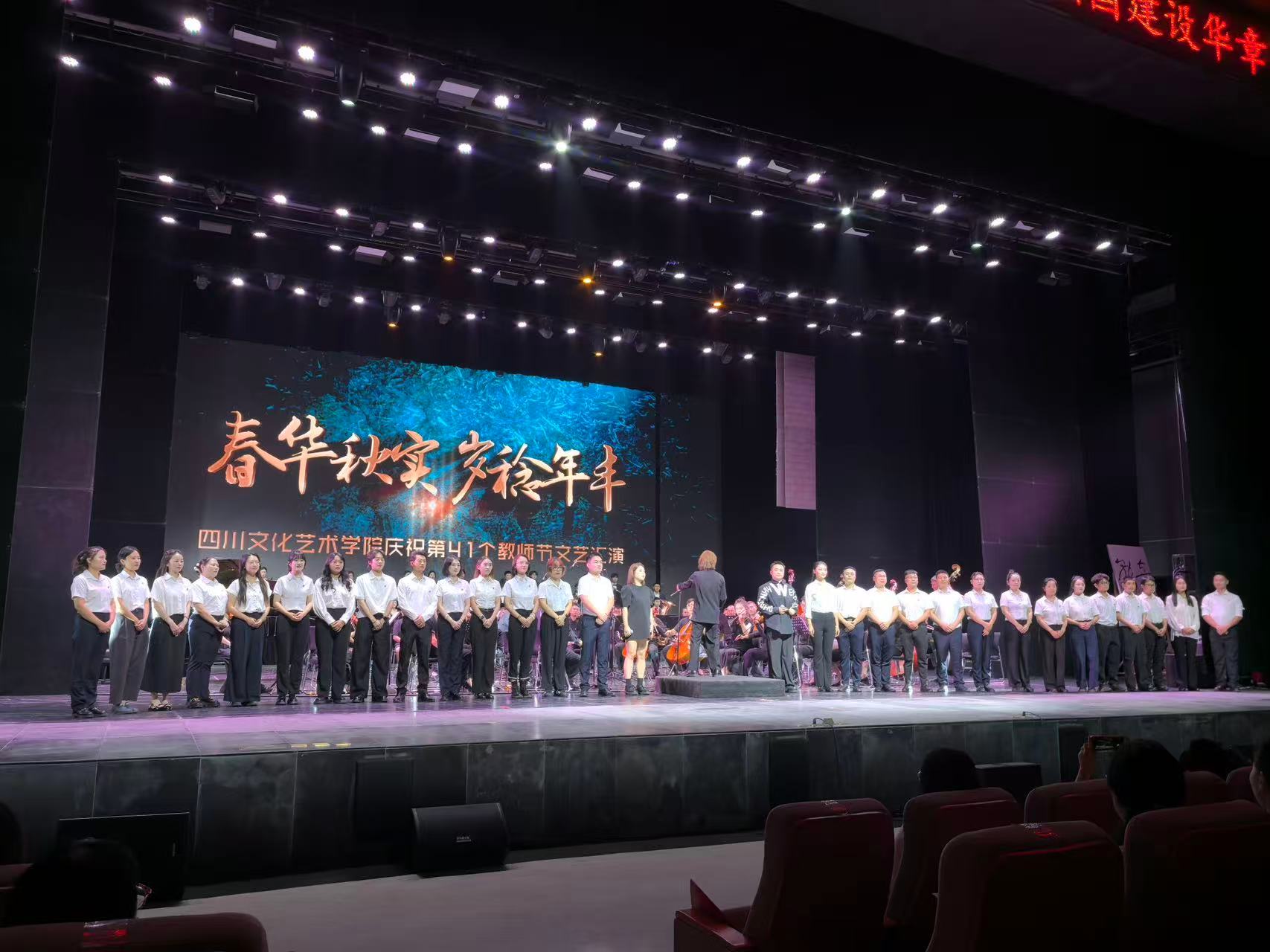 表彰大会结束后,在场领导和师生共同欣赏《春华秋实 岁稔年丰——四川文化艺术学院庆祝第41个教师节文艺汇演》。国际交流学院何英捷老师亮相压轴节目,共同合唱校歌《开创美好明天》,表现出积极昂扬的精神面貌。