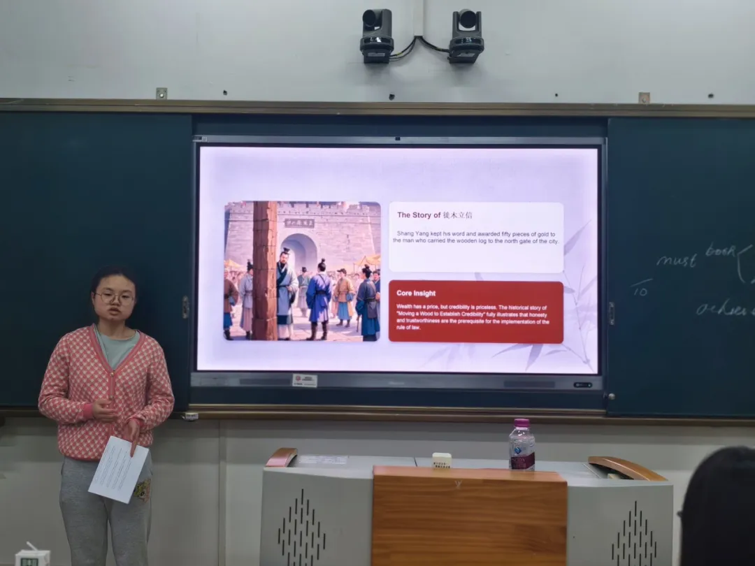 聚焦社会进步,有小组用“徙木立信”的故事和“Wealth has a price, but credibility is priceless”一句,说明诚信对法治社会的基础意义;也有小组从“自由、平等、公正、法治”的整体框架出发,分析其在社会生活中的具体表现。