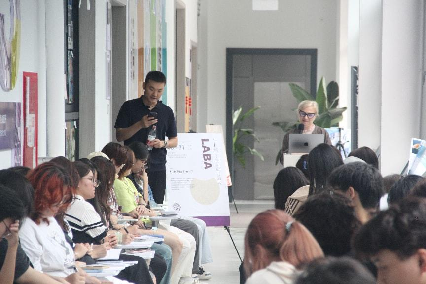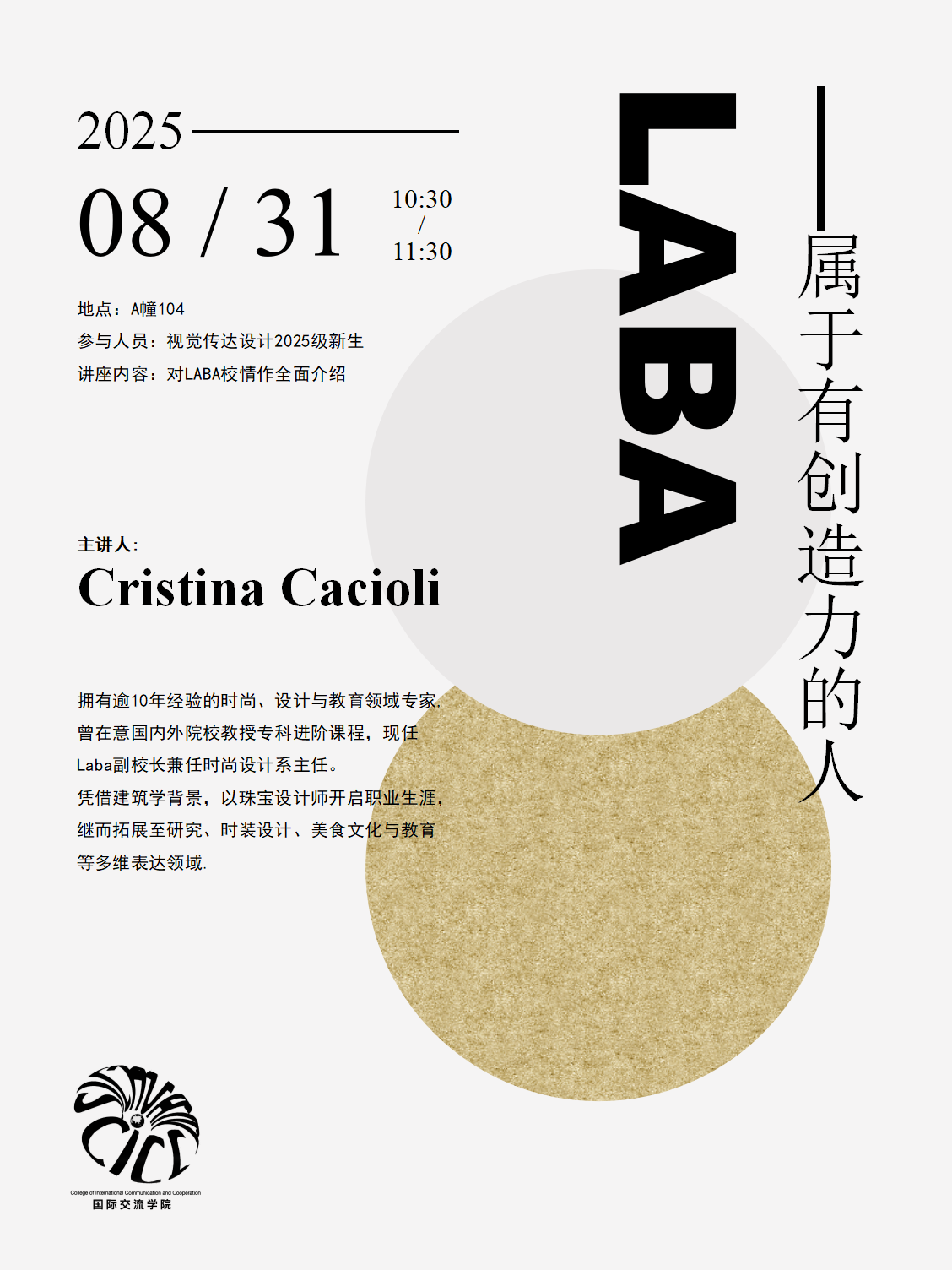 2025年8月30日10:30-11:30,在A幢104教室,拥有逾10年时尚、设计与教育领域经验的意大利LABA自由美术学院副校长兼时尚设计系主任Cristina Cacioli,为视觉传达设计2025级新生及视传全体专业教师带来了主题为“LABA——属于有创造力的人”的学术讲座,核心围绕创造力培养、留学生活等议题展开深度交流。
