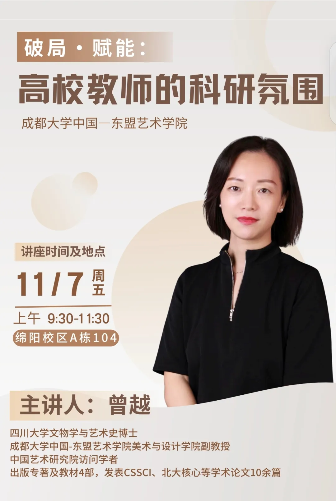 为深入贯彻落实新时代高校科研创新发展要求,全面提升教师科研素养与学术水平,推动科研引领教学、科研服务社会,持续构建高水平、有特色的科研体系,特邀成都大学东盟艺术学院曾越教授,为国际交流学院全体教师带来一场题为《高校教师科研突围指南》的专题讲座。