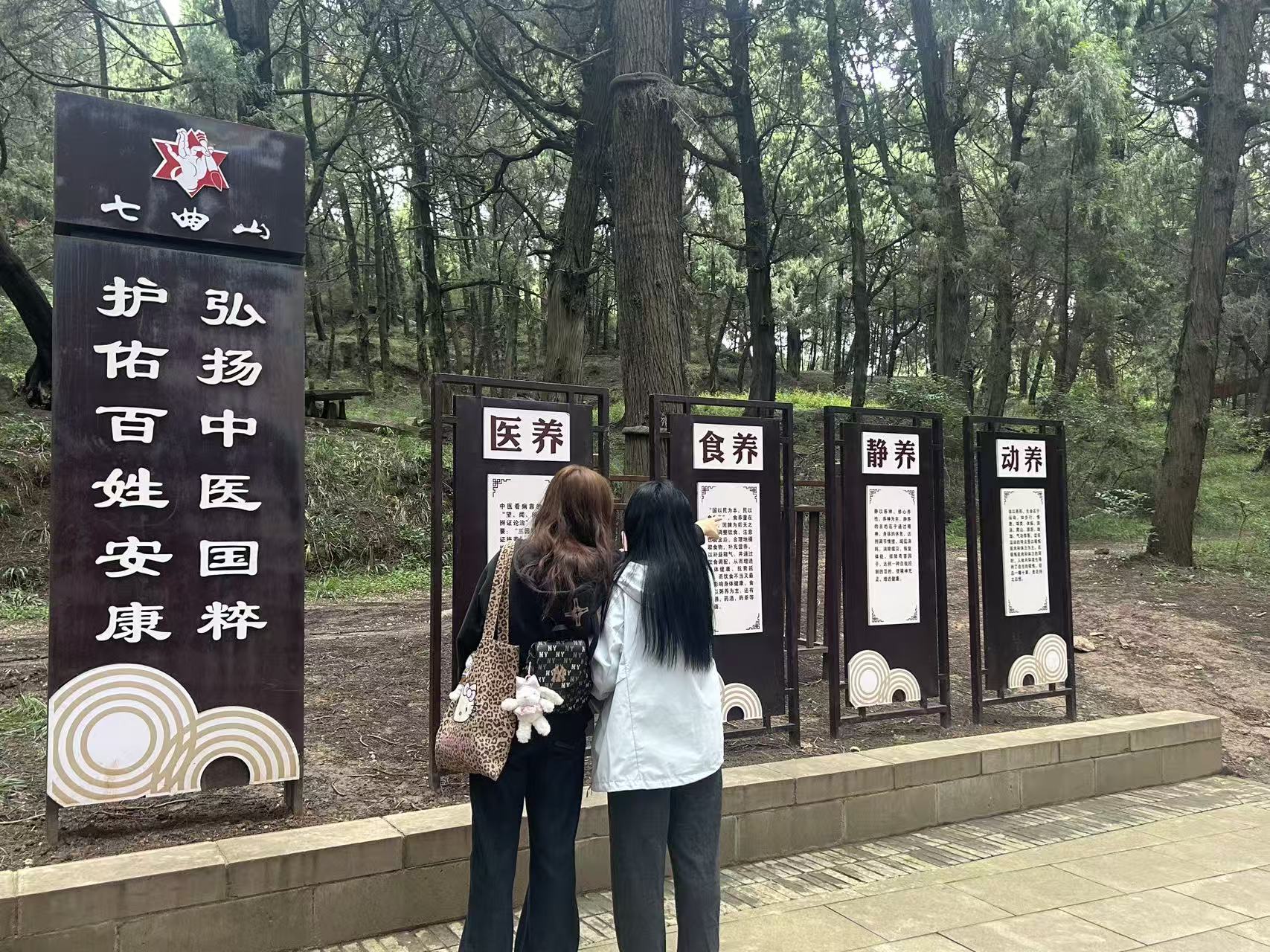 上午抵达七曲山,康养步道成为同学们的“实景课堂”。漫步于葱郁林海间,清新空气与厚重文脉交融,同学们沉浸式感受森林生态的康养价值。大家驻足步道旁的科普牌前,将课堂所学的健康养老理论与森林植被、生态环境、传统康养设施等实景结合,细致记录生态环境数据,体验传统康养器械,从生态、人文、实操等多维度拓展对康养服务场景的认知边界。